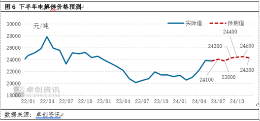 综合上述分析,卓创资讯略有修正《2022-2023中国锌市场年度报告》中关于下半年的趋势预测。年报中预测下半年呈现出先跌后涨再跌的表现,本次主要预测7月上涨,8月下跌,而后预测同年报一致。本次预测7月上涨,主要在于7月冶炼厂集中检修较多,锌产出下滑预期较为明显,市场情绪整体偏暖。整个下半年来看,高点或出现在11月,低点出现在8月份,多与供需变动有关。预计下半年市场价格均价重心上移至24250元/吨附近,价格运行区间或在23000-25000元/吨,全年均价较2023年上移。
