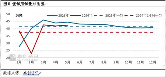下半年还值得关注的一个方面在于需求端,预计下半年需求或好于上半年。就锌下游最大领域镀锌行业来看,2024年1-5月,月均用量仅在37.54万吨,相比于2023年月均的41.14万吨下滑了3.6万吨,幅度为8.75%。