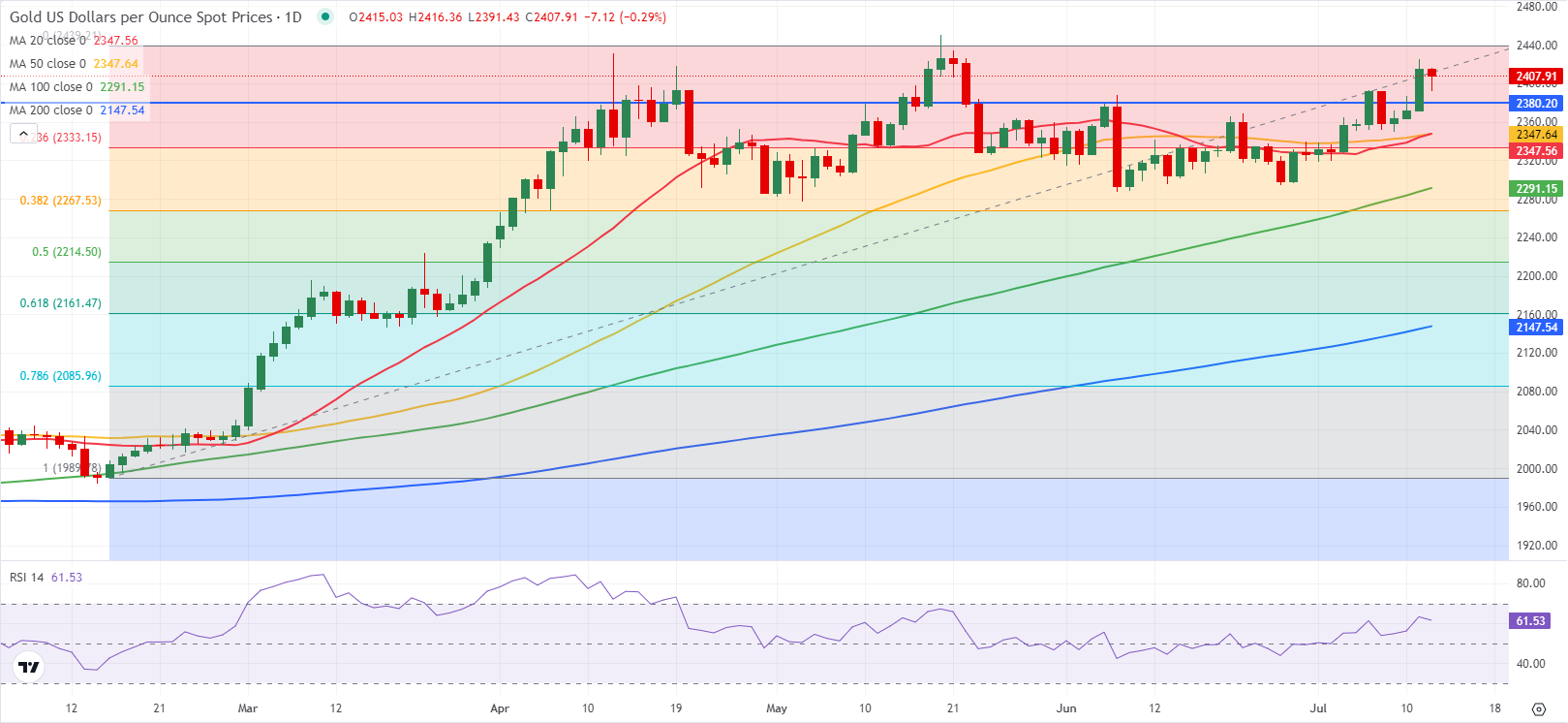 周一(7月15日)亚市尾盘,现货黄金维持日内温和反弹走势,目前金价位于2413美元/盎司左右。本交易日,投资者将聚焦美联储主席鲍威尔讲话,预计将引发黄金市场大行情。