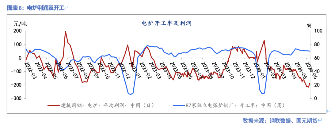 上周,247家钢厂盈利率为44.59%,环比增加1.73个百分点;西南地区电炉峰电利润亏损159.2元/吨,环比下降23元/吨,谷电利润为13.8元/吨,环比下降22.8元/吨。