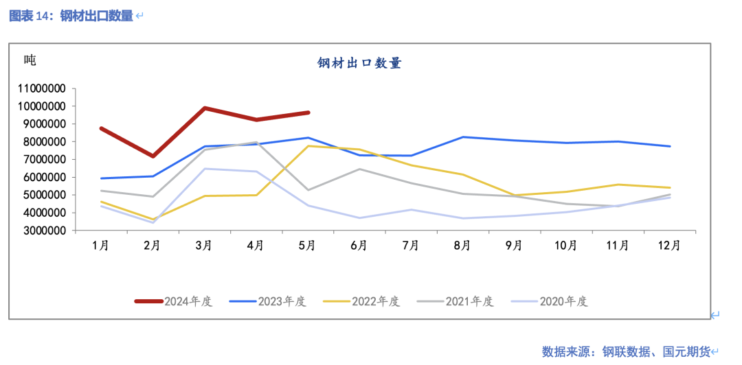 直接出口维持高位,5月钢材出口963.10万吨,环比增加4.46%。间接出口方面,船舶出口增加,汽车出口下滑。5月,汽车出口48.13万辆,环比下降4.43%,出口船舶562艘,环比增加16.84%。