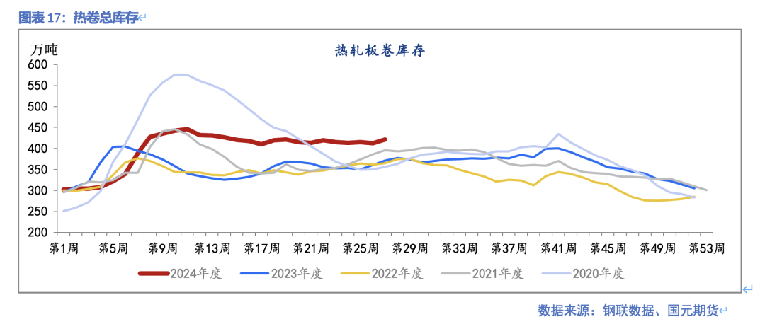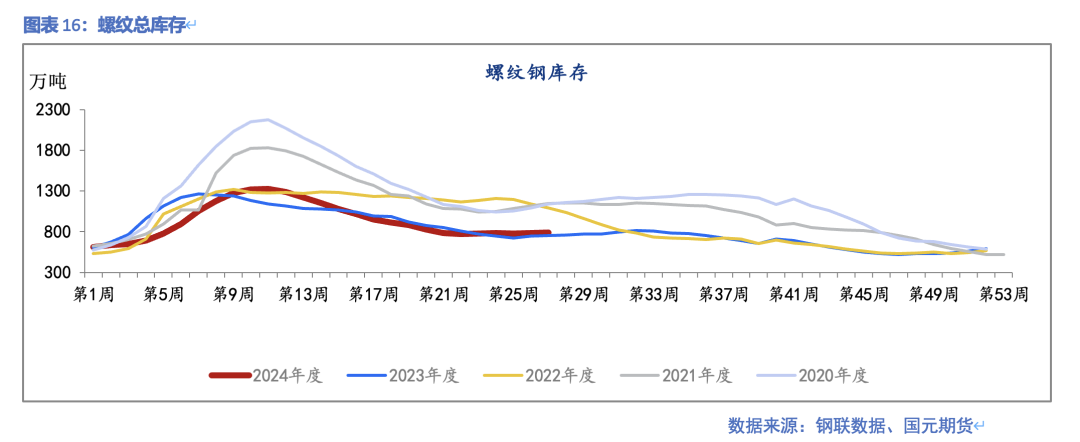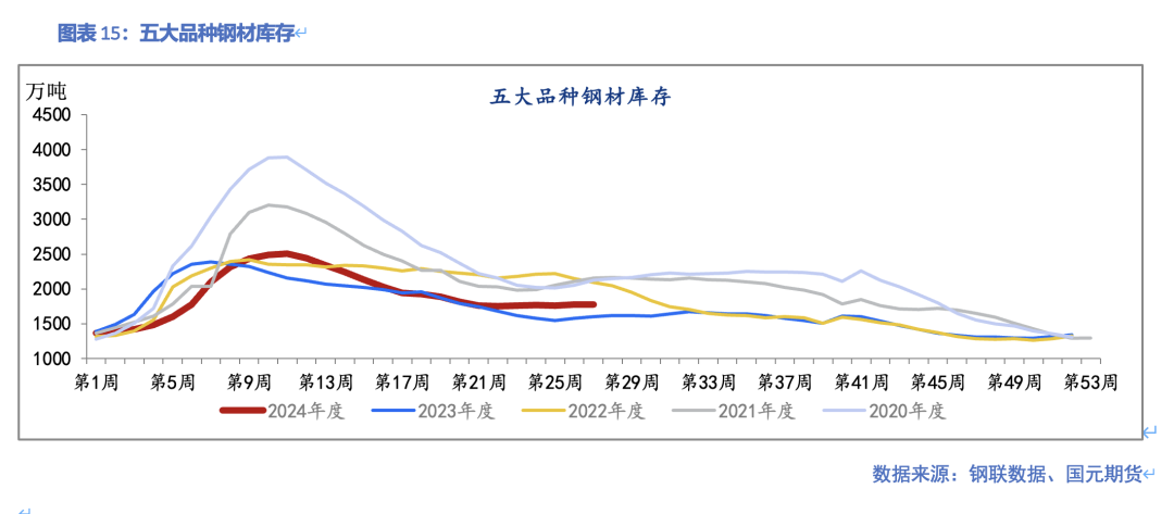 上周,五大品种钢材总库存1779.99万吨,周环比增加6.08万吨,其中钢厂厂内库存减少11.68万吨,社会库存增加17.76万吨。螺纹库存786.59万吨,环比基本持平;热卷库存421.39万吨,环比增加8.59万吨。
