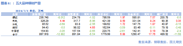 上周五大品种钢材供应897.92万吨,环比下降12.8万吨。其中除热轧卷板外,其余钢材品种产量均环比下滑。螺纹样本钢厂产量236.75万吨,环比下降8.01万吨;热轧卷板样本钢厂产量326.29万吨,周环比增加4.44万吨。
