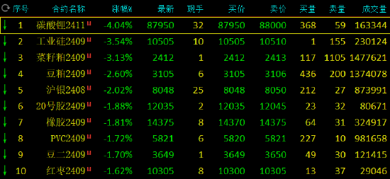 期货收评:碳酸锂跌超4%,工业硅、菜粕跌超3%,豆粕、沪银跌超2%;集运指数、生猪、焦炭、氧化铝涨超2%