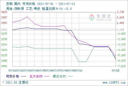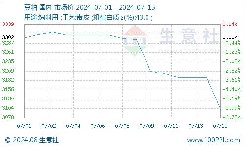 期货:7月开始,美豆播种进度较快,丰产预期增加,天气题材利多动力不足。USDA报告,美豆种植面积略降,供应宽松为主。外盘豆类期货行情打压,国内豆粕期货行情跟盘下行。7月15日,连豆粕主力合约收3105元/吨,单日下跌83元/吨,较月初下跌7.75%。期货行情持续疲软,国内豆粕现货行情跟跌。