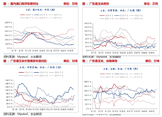 从库存端来看,由于进口玉米及谷物性价比较高,导致内贸玉米需求不足,库存同比大增,拖累国产玉米价格。后续,全球玉米丰产预期犹在,粮价存压,进口利润或持续凸显,国产玉米价格持续承压概率较大。