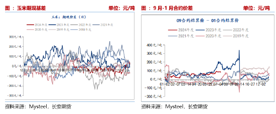 7月12日,锦州港口玉米与2409合约基差约为31元/吨,扭转今年以来长期负基差状态,由于期货盘面回吐前期天气升水。不过,基于当前连盘仓单中性偏高、当下供应不及预期宽松以及产销倒挂的局面,接货存在风险,盘面或持续承压于偏空的基本面。而经过半个多月的期价下跌,盘面已具备做多的中长期价值,但缺乏上行驱动,短期或承压运行,正基差有望维持。2023年10月以来,9-1价差持续保持正值,且5-9价差持续负值,暗示玉米供需进一步宽松。叠加考虑新作种植成本降低,9-1正套或仍有盈利空间。