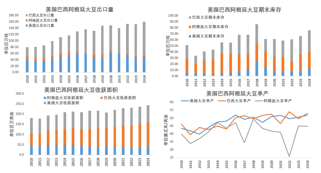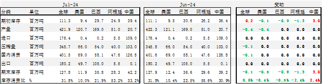 旧作方面的调整,中国2023/24年度大豆进口量上调300万吨至1.08亿吨,不过压榨量未做调整,因此使得中国24/25年度的期初库存顺势增加。阿根廷2023/24年度大豆产量下调50万吨至4950万吨。巴西产量未做调整,仍然为1.53亿吨。
