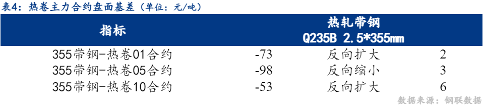 5日市场热卷10合约与355带钢价差反向扩大6元/吨,热卷05合约与355带钢价差反向缩小3元/吨。