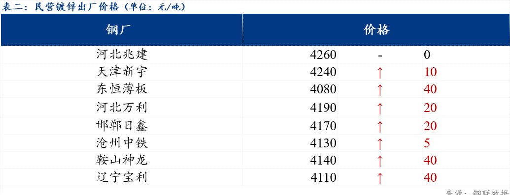 现北方地区民营镀锌板卷整体出厂价格在4070-4260元/吨。