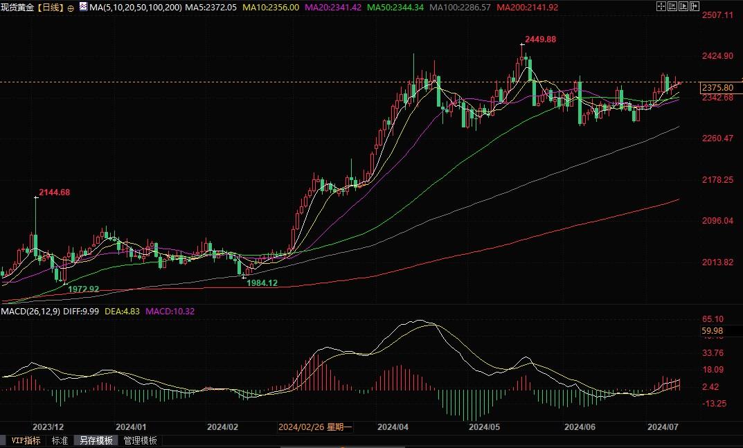 现货黄金日线图北京时间7月11日9:50,现货黄金报2375.58美元/盎司