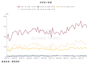 据海关总署公布的数据显示,中国2024年5月纸浆进口量为282.1万吨,环比减少12.5%,同比减少10.6%,全年累计进口量1522.5万吨,累计同比增涨4.8%。其中,漂白针叶浆进口数量70.4万吨,环比减少14.2%,同比减少16.4%,全年累计进口量387.9万吨,累计同比+5.0%;漂白阔叶浆进口数量125.6万吨,环比减少7.5%,同比减少3.6%,全年累计进口量658.0万吨,累计同比+5.7%。受供应缩减的影响,纸浆进口量缩减明显,其中作为交割品的漂针浆更为明显。由于前期浆厂检修等因素的影响,预计6、7月份纸浆进口量仍存减量预期,供给端中期仍存偏多影响。