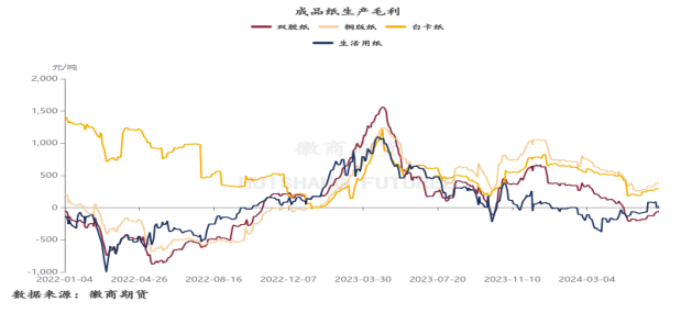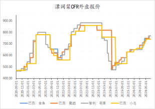 纸浆对于进口的依赖程度较大,故此纸浆的外盘报价是国内纸浆价格的重要参考对象,自2024年3月至6月,得益于纸浆供应端的利好纸浆外盘报价不断上涨,月均上涨在30-50美元/吨。但据悉,UPM、芬林芬宝Mets 于6月20日通知中国客户新一轮针叶浆报价,面价为870美元/吨,较上一轮持平。近期纸浆最新的外盘报价虽未能延续涨势,但依旧维持在高位水平,给浆价带来一定的支撑。