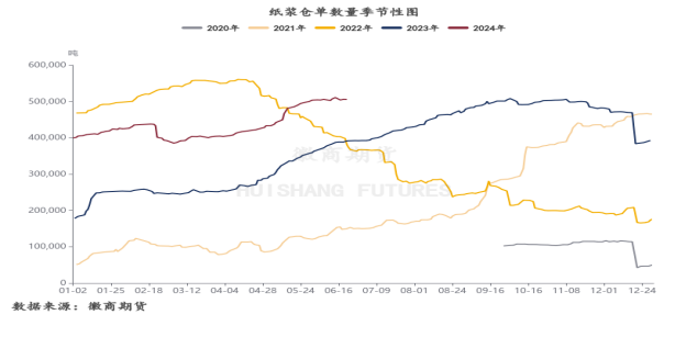 截至2024年6月21日上期所纸浆仓单库存505583吨,其中俄针占较大部分。但是,受制于纸浆期货的交割标准,其中大部分纸浆仓单在今年年末时将会被强制注销,并且不能再进行注册,届时注销的纸浆将会流向现货市场,对现货市场产生一定的冲击,注意防控仓单集中注销的风险。