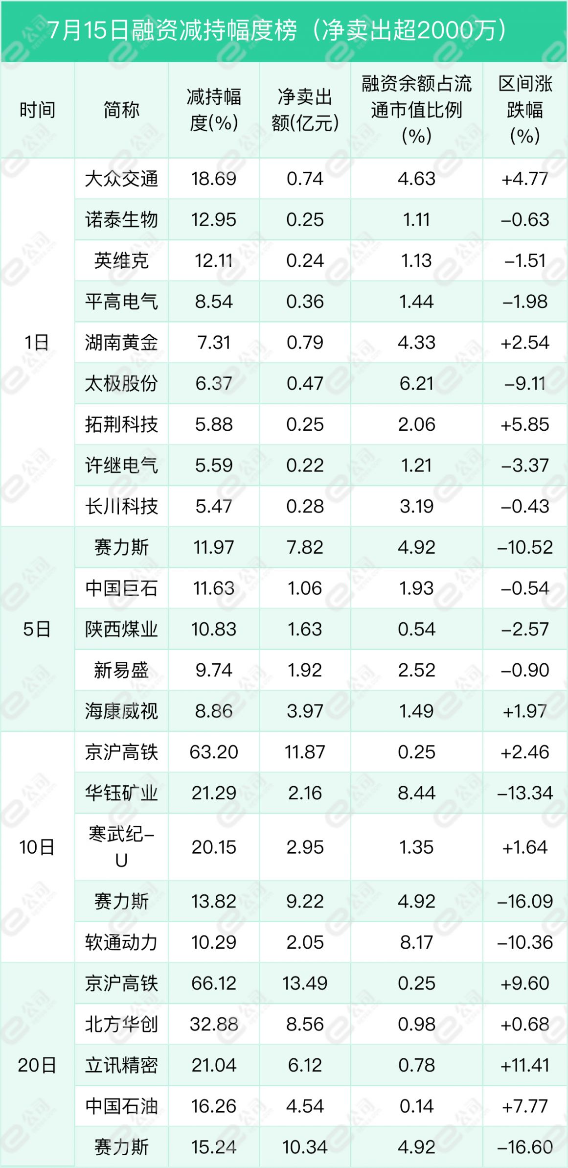 大众交通、诺泰生物、英维克遭融资减持幅度居前,分别为18.69%、12.95%、12.11%。