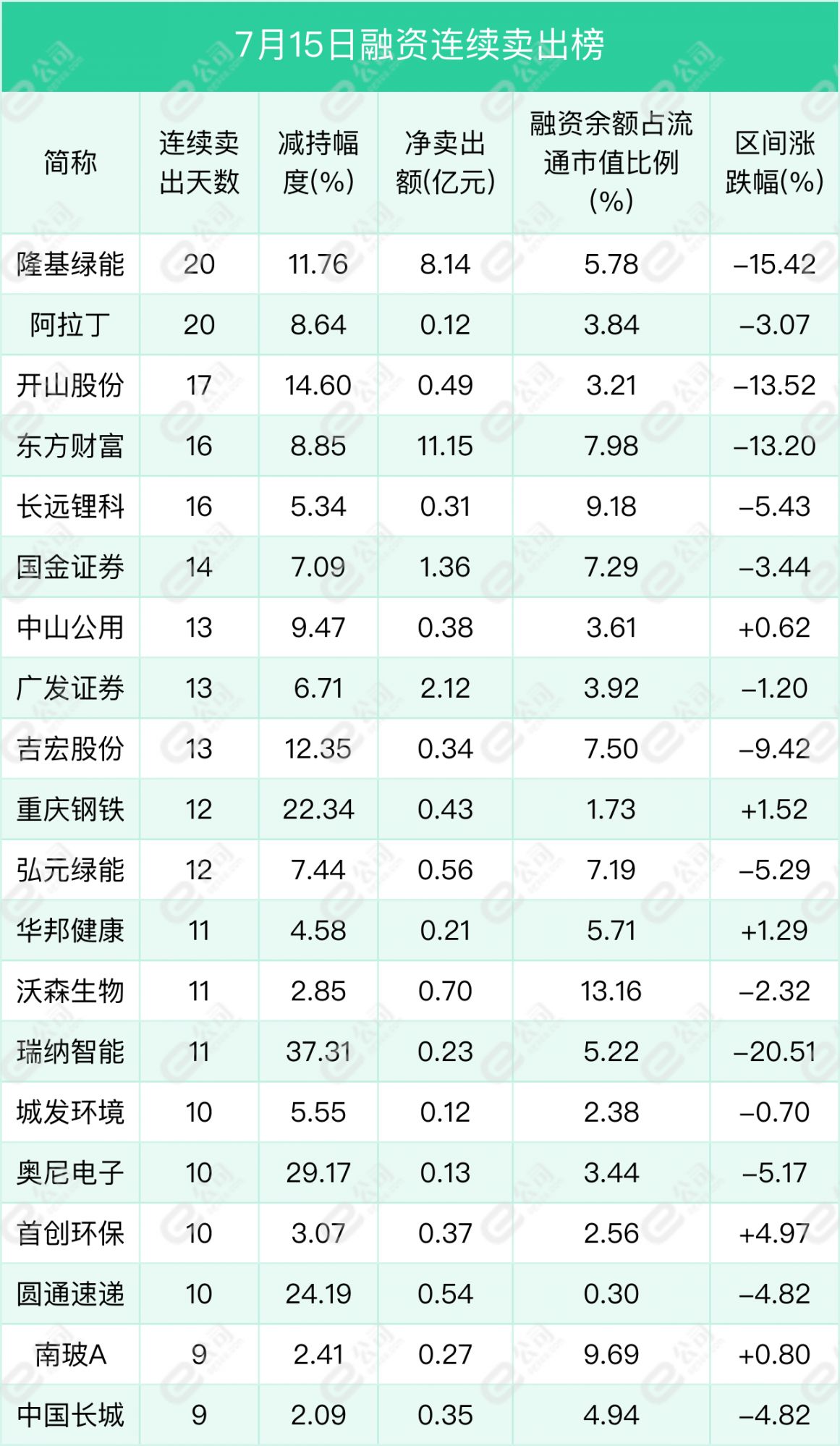 隆基绿能、阿拉丁、开山股份遭融资连续净卖出天数居前,分别为20天、20天、17天,期间净卖出额分别为8.14亿元、0.12亿元、0.49亿元,期间减持幅度分别为11.76%、8.64%、14.6%。