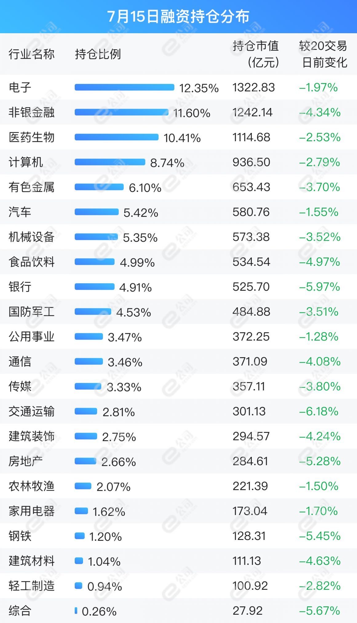 e公司数据统计显示,截至7月15日,融资持仓市值前五行业为电子、非银金融、医药生物、计算机、有色金属,占持仓总市值49.19%。