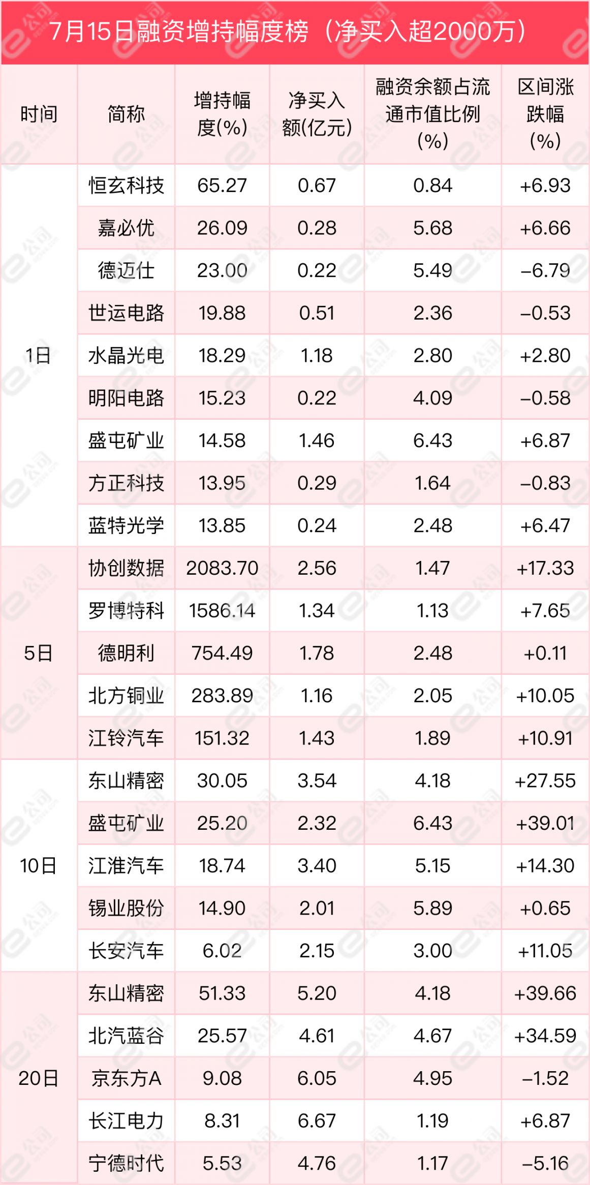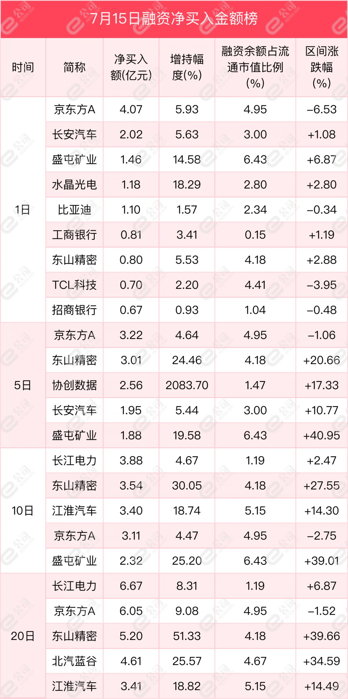 从买卖金额来看,京东方A、长安汽车、盛屯矿业获融资净买入金额居前,分别为4.07亿元、2.02亿元、1.46亿元,增持幅度分别为5.93%、5.63%、14.58%。
