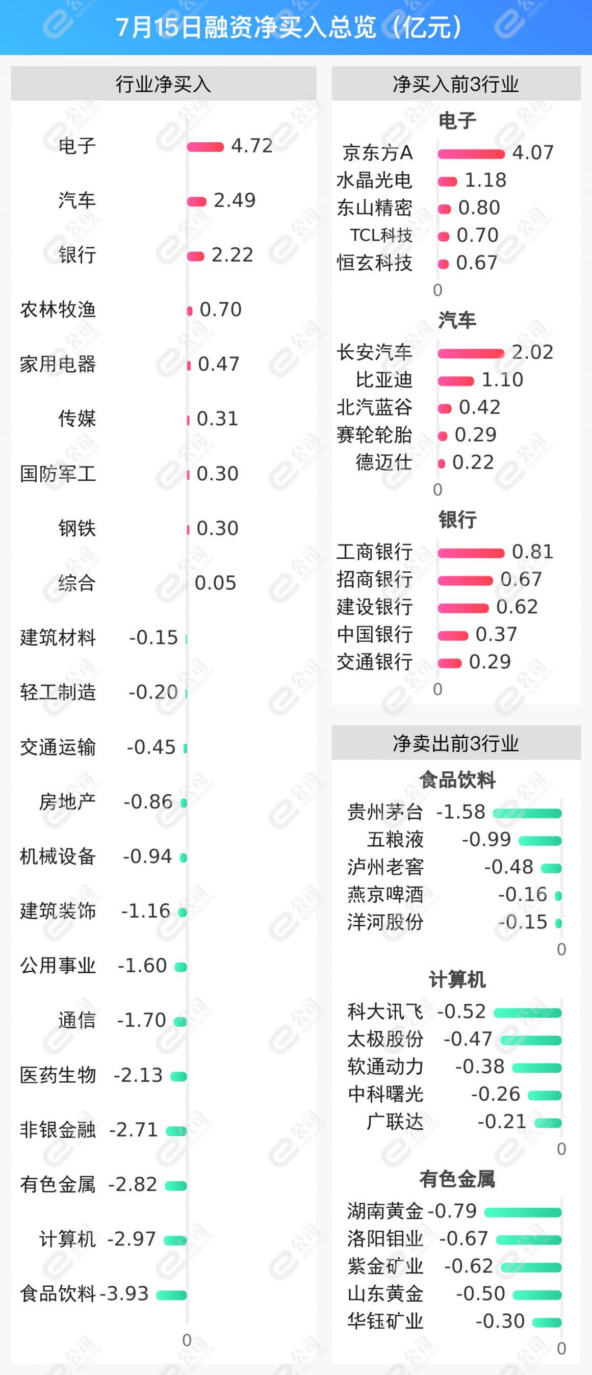 电子、汽车、银行获融资净买入金额居前,分别为4.72亿元、2.49亿元、2.22亿元。