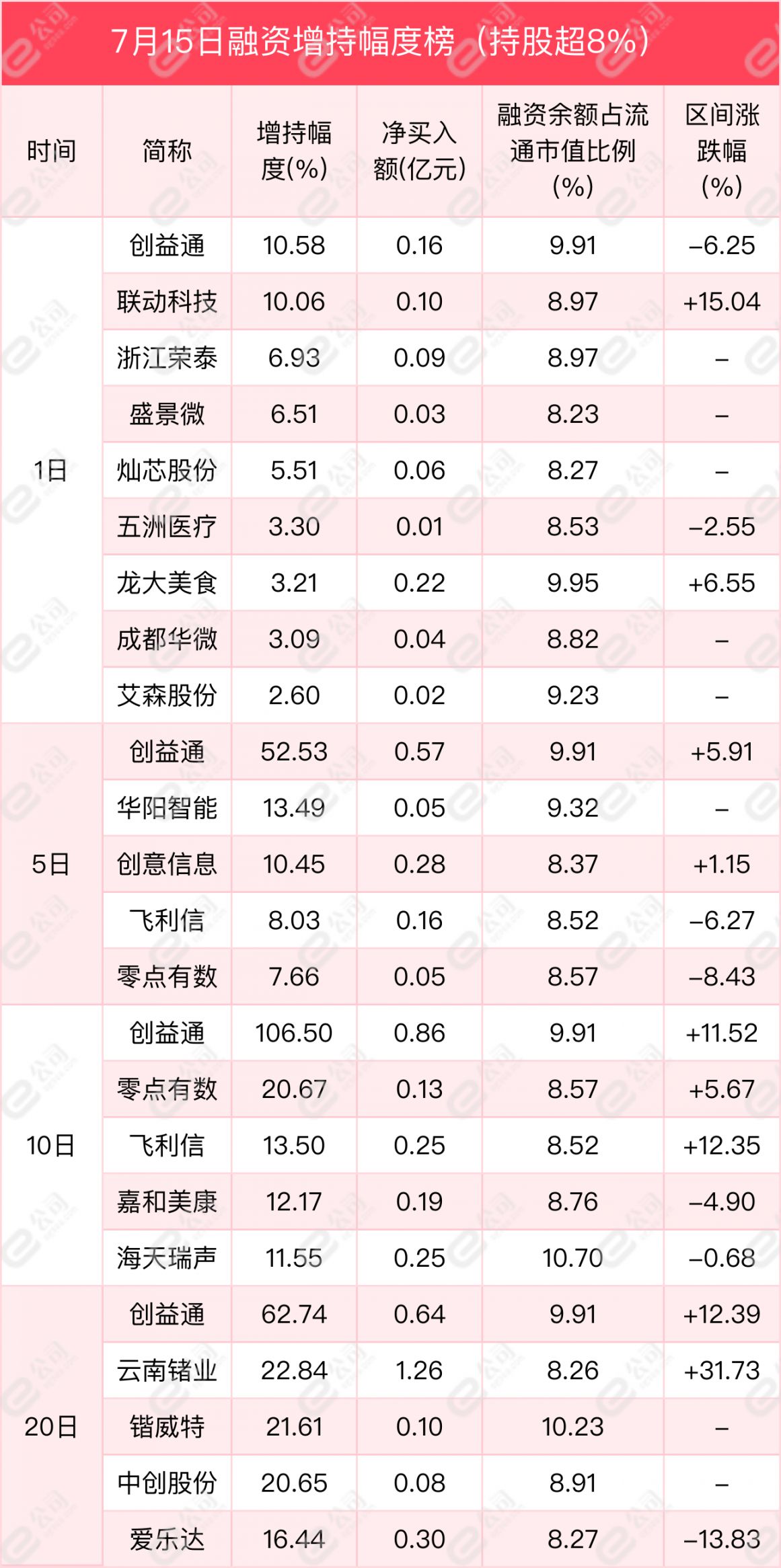 从增减持幅度来看,融资余额占流通股比例超8%的个股中,创益通、联动科技、浙江荣泰获融资增持幅度居前,分别为10.58%、10.06%、6.93%。