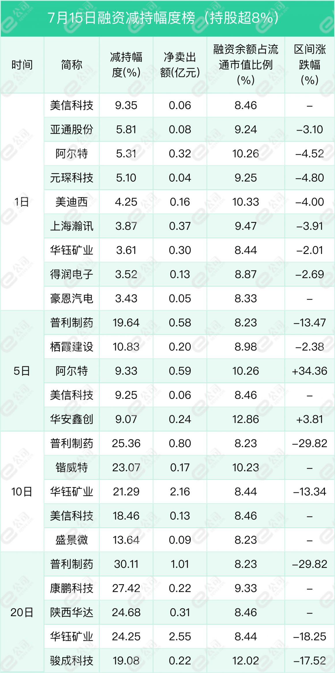 美信科技、亚通股份、阿尔特遭融资减持幅度居前,分别为9.35%、5.81%、5.31%。