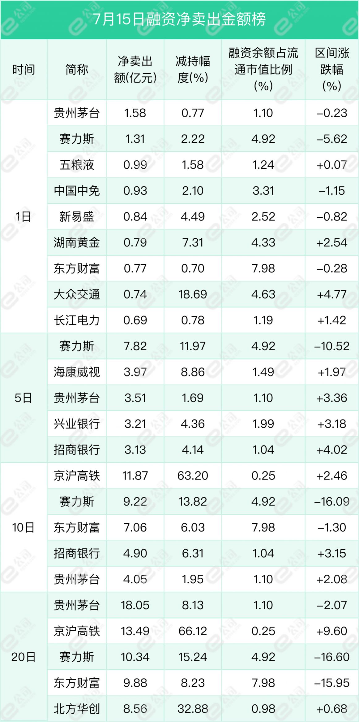 贵州茅台、赛力斯、五粮液遭融资净卖出金额居前,分别为1.58亿元、1.31亿元、0.99亿元,减持幅度分别为0.77%、2.22%、1.58%。
