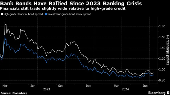 融资环境对银行发行人来说很有吸引力。投资级债券的风险溢价(投资者持有风险较高的债券获得的高于美国国债的额外溢价)周五收窄 1 个基点至 89 个基点。金融机构债券的平均利差仅比更广泛的高等级指数高 4 个基点。