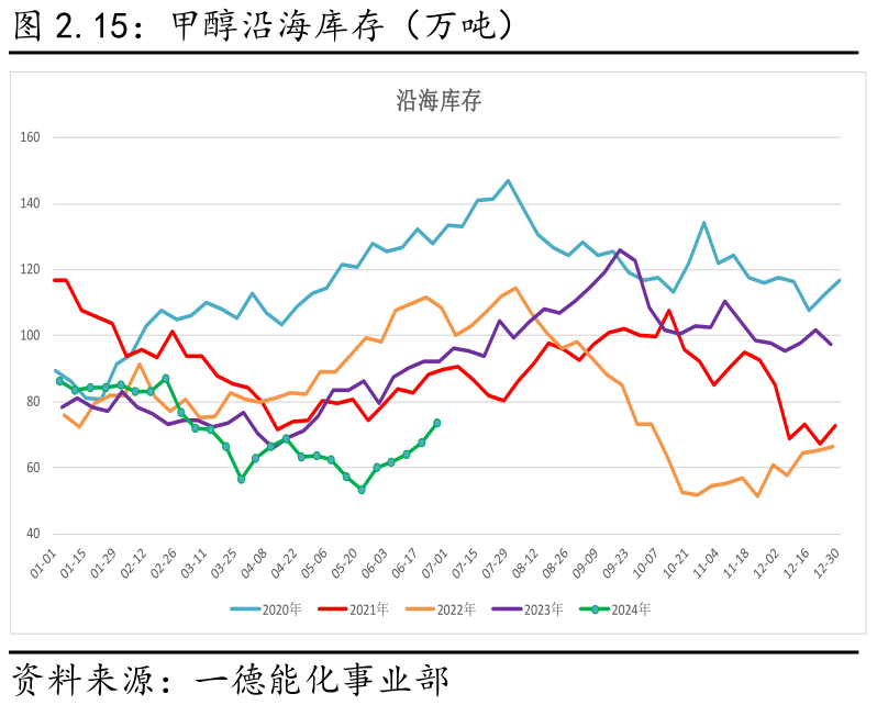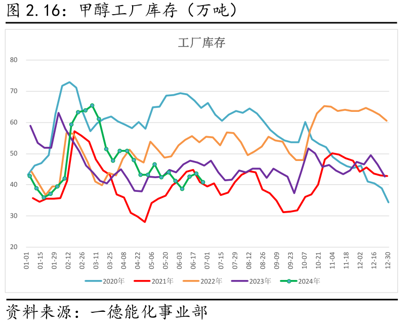 2024年上半年,甲醇沿海库存先抑后扬,内地库存冲高回落。沿海方面,库存水平主要受进口量影响,3月和5月我国到港持续减量,沿海库存不断走低,5月下旬随着进口增加和需求回落,沿海库存开始筑底回升,目前开始呈现加速上涨的趋势。内地方面,春节期间内地工厂大幅累库,节后内地货源持续流入港口套利,内地库存开始高位下行,随着内地装置春季检修进程的推进,内地供给继续下降,内地库存持续回落。三季度,随着进口到货逐步回升,以及内地甲醇供给的恢复,无论沿海库存还是内地库存,预计均会进入累库周期。