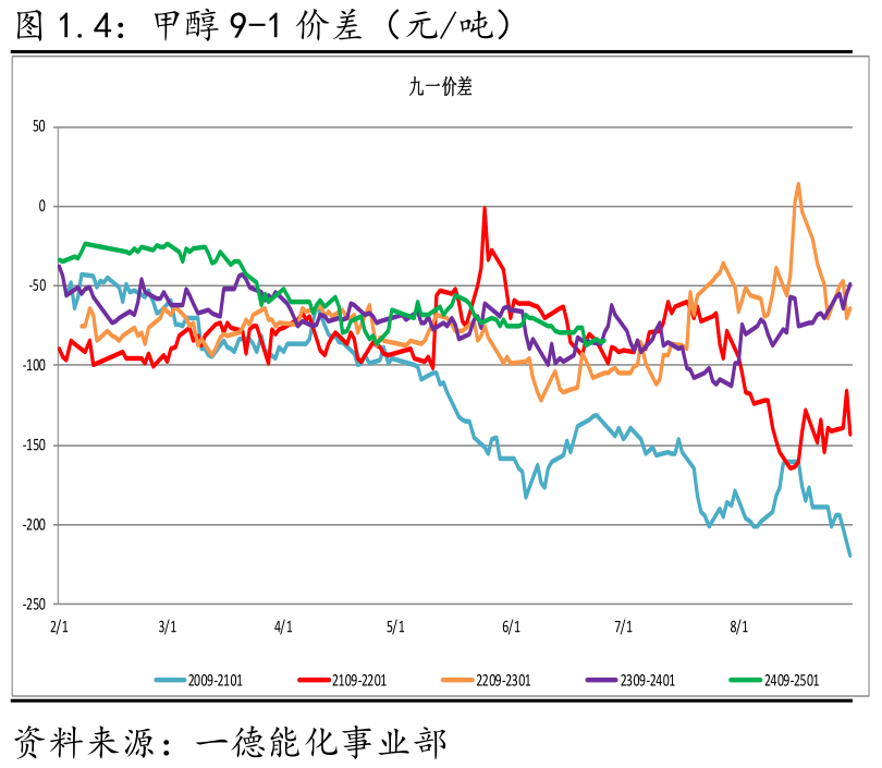 基差、月差方面,09合约基差于5月下旬突破300后迅速见顶回落,目前已经下降到期现平水附近,预计后期大概率将维持这一水平。9-1月差整体偏弱运行,三季度甲醇市场大概率进入累库周期,加之目前看基差支撑较弱,因此整体维持继续逢高反套的观点。