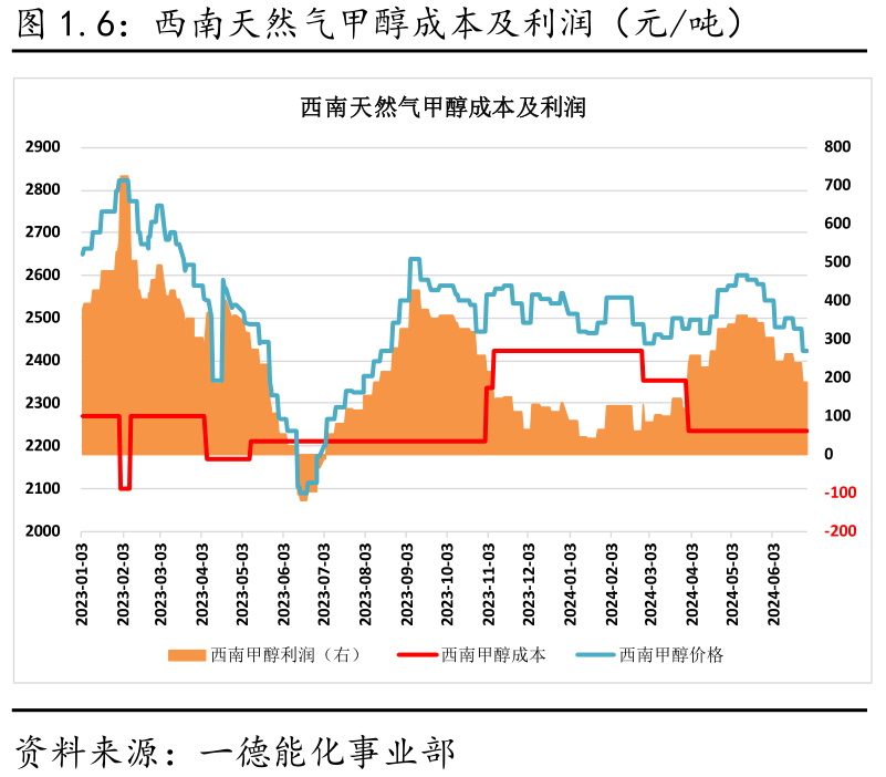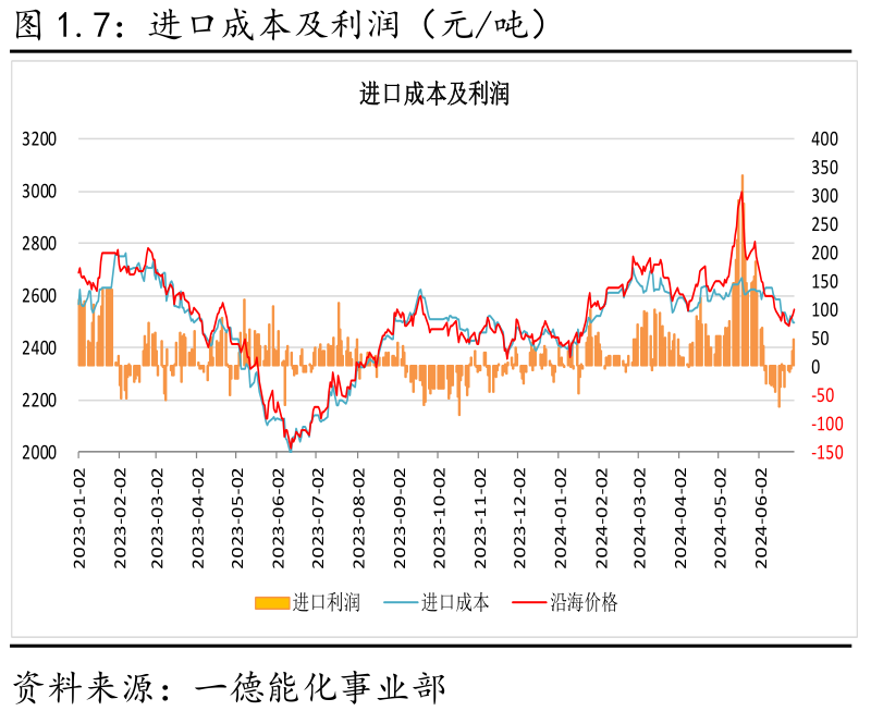 利润方面,2024年上半年煤制甲醇利润显著提升,特别是3月份开始,内地货源大量流入沿海,阶段性供不应求叠加成本下降,利润快速上升并于5月初达到阶段性高点,后随着成本抬升及需求转弱,利润转而回落,目前利润仍能维持中上水平;气头利润上半年整体冲高回落,利润上升的主要是气头成本下降,但5月份后随甲醇价格下降而回落,目前处于中下水平;进口利润上半年整体冲高回落,主要跟随沿海价格涨跌变动,6月出现阶段性亏损,但目前已恢复至略有盈利,总体处于历史中等水平。