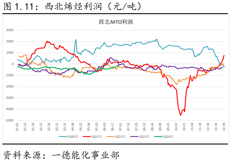 烯烃利润方面,2024年上半年,按外采甲醇计,西北及华东MTO段利润整体呈现先抑后扬走势。其中,西北烯烃现多为CTO一体化装置,由于煤制甲醇利润较高,西北烯烃整体维持盈利状态;然而,华东烯烃多以外采甲醇为主,因此上半年亏损较重,特别是在5月,受华东甲醇价格大涨影响,利润下降更为显著,导致多套装置停车或降负,甲醇价格受此影响快速回落,利润才再度回升。