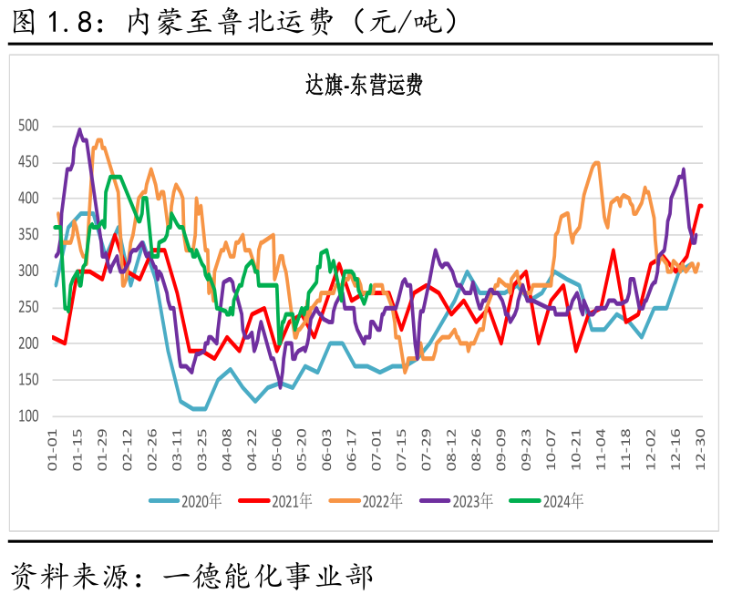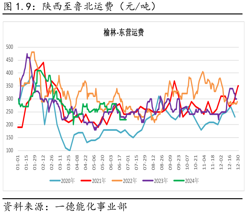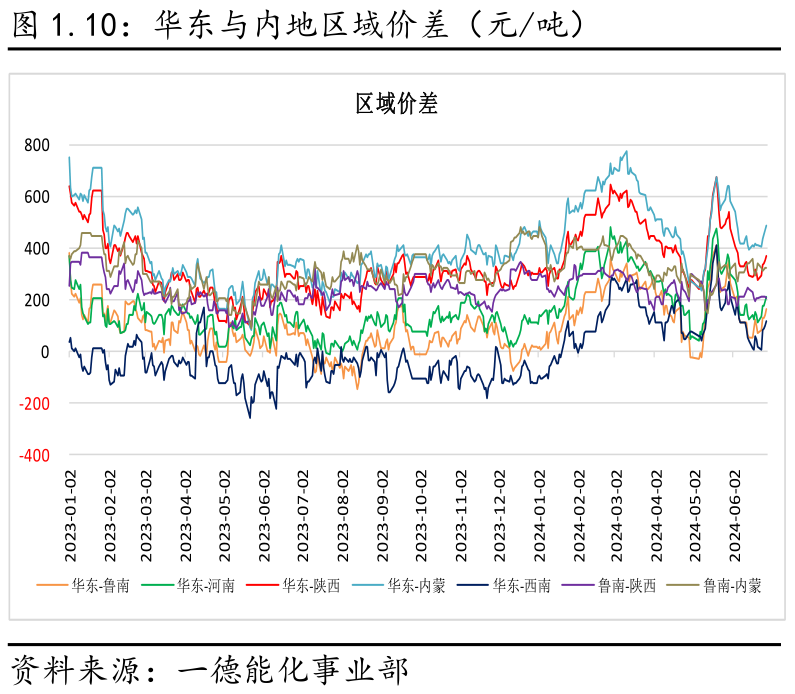 物流成本方面,2024年上半年,内地运费整体呈现高位回落走势。一季度受春节、两会影响,运费整体高位运行,之后随着运力恢复及道路安检放松,运费震荡回调;二季度受进口不及预计、内地需求转弱影响,运费维持震荡运行,但较往年同期水平略偏高,目前西北到鲁北运费大体在220-280元/吨区间。区域价差方面,2024年上半年,内地到沿海的区域价差整体呈现“M”形走势,两个高点分别对应3月中旬沿海库存加速下行和5月下旬沿海库存新低的时点,反映了沿海地区阶段性货源偏紧价格偏高的一个局面。