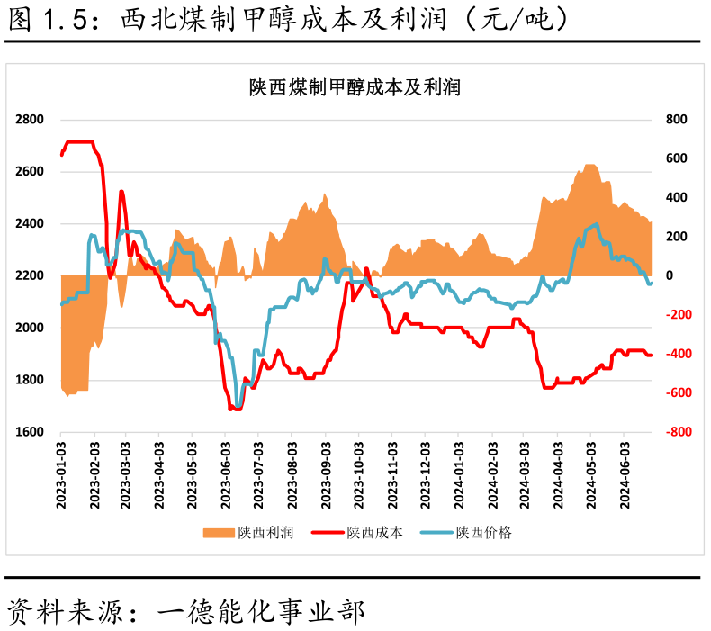 煤制成本方面,2024年上半年,煤炭价格整体高位回落,一季度煤矿供给恢复,气温回升电厂日耗下降,煤价显著回落,二季度迎峰度夏预期带动煤价小幅反弹,但今年南北方气温分化明显,北方高温天气持续,居民用电提升,但南方降雨频繁,气温比往年同期要低,居民用电相对偏少,此外水电、核电、风电、光伏等非煤电补充较多,相比煤电的需求有所减弱,加之进口煤价较国内更具经济性,这些因素也抑制了煤炭价格的上涨。因此,短期来看,煤炭市场多空因素并存,在电厂日耗未拉起前,市场将延续当前僵持局面,煤价恐难有大波动。但若后期南方高温兑现,电厂日耗快速提升,也不排除煤价迎来一轮上涨的可能。截至目前,西北煤制甲醇成本在1800-1900元/吨,叠加运费折盘面成本大概在2200-2250元/吨。气头成本方面,2024年上半年,西南气价下调后维持横盘运行,目前气头甲醇成本大致位于2200-2250元/吨区间。进口成本方面,2024年上半年,甲醇进口价格先涨后跌,价格从年初的2400元/吨上升到最高2700元/吨,目前在2500元/吨附近。