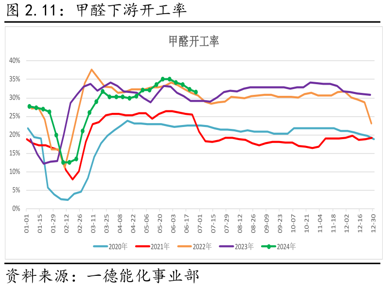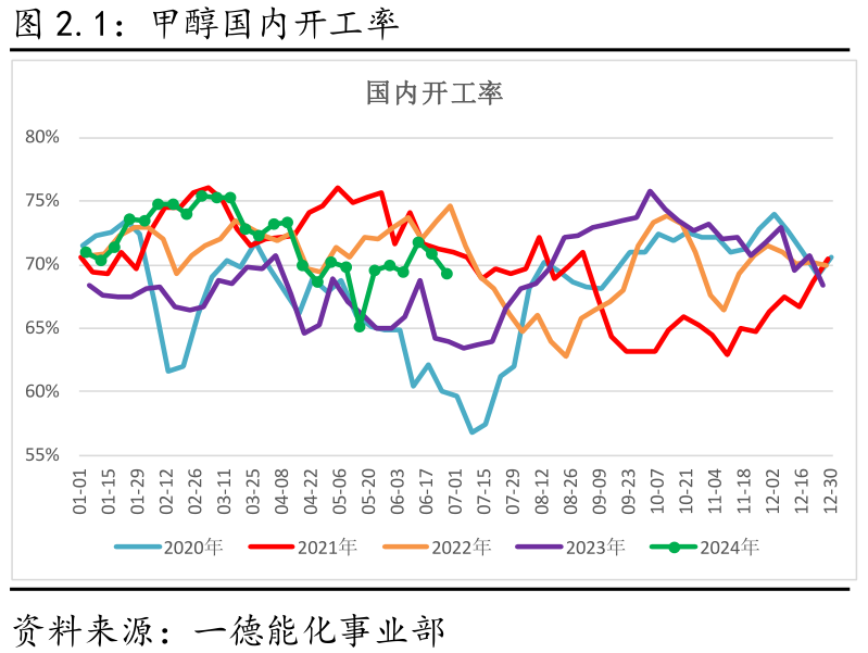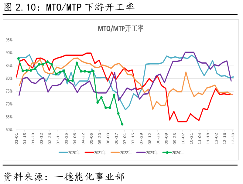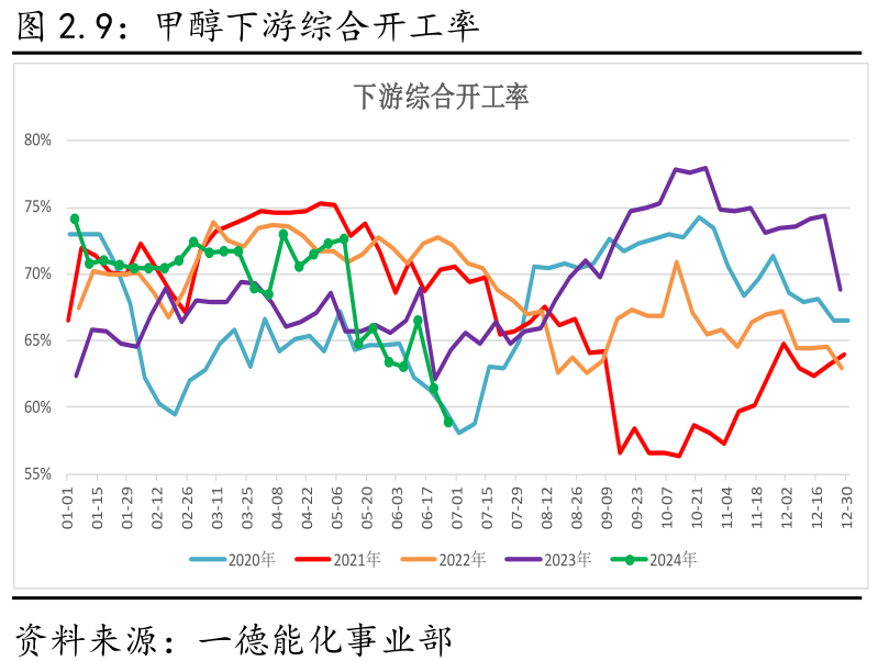 2024年上半年,甲醇下游综合开工整体呈现高位回落走势。1-4月份甲醇下游开工维持中高水平,但5月起随着烯烃亏损愈发严重,沿海外采甲醇装置开始接连停车检修,5月10日浙江兴兴停车,5月15日阳煤恒通停车,5月18日南京诚志一期停车等,甲醇下游烯烃开工持续显著回落,并创历史新低。此外,7月仍有甲醇制烯烃装置停车检修计划,如诚志7月10日停大开小预期,宝丰三期7月初部分烯烃装置检修传闻等,但同时也有久泰、渤化等烯烃装置重启预期存在,加之目前烯烃利润较5月已出现明显回升,因此也不排除下半年烯烃开工再度回升的可能。