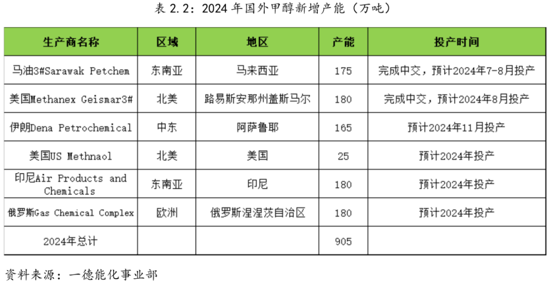 2024年,预计海外甲醇新增产能905万吨,其中马油三期175万吨完成中交,预计7-8月份投产,美国梅赛尼斯三期180万吨完成中交,预计8月份投产,伊朗Dena165万吨计划四季度投产,其他装置投产时间未定。具体投产情况如下表: