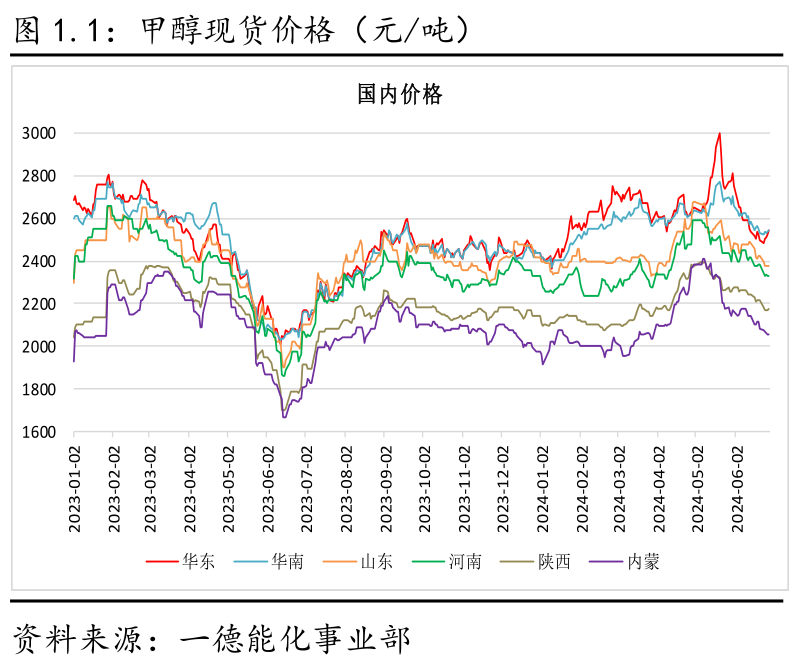 2024年上半年,甲醇价格整体冲高回落。一季度,海外开工大幅下降,进口到港持续低位,港口MTO需求相对稳固,加之受物流限制内地甲醇流入华东数量有限,使得港口库存持续下降,沿海价格大幅走高,而内地市场受高供给、高库存、高运费、弱需求等因素压制影响,价格整体低位震荡运行。二季度,受伊朗供给回归推迟及多套非伊装置检修影响,进口到货严重不及预期,港口库存小幅反弹后再度加速去化,于5月下旬创阶段性新低,同时内地装置陆续进入春季检修期,供给下降显著,沿海及内地共振去库,国内价格普涨并创上半年阶段性新高。但与此同时,下游行业特别是外采甲醇烯烃装置亏损不断加重,5月中旬起多套MTO装置陆续停产或降负,需求负反馈影响被触发,进入6月国内外供给逐渐恢复,沿海及内地库存转而回升,甲醇供需开始由偏紧转向宽松,加之6月中旬海外降息确认衰退预期,大宗商品氛围转弱,甲醇价格冲高回落。国际方面,上半年受海外装置开工不高及需求转弱影响,国际甲醇价格整体震荡运行,波动幅度较为有限。