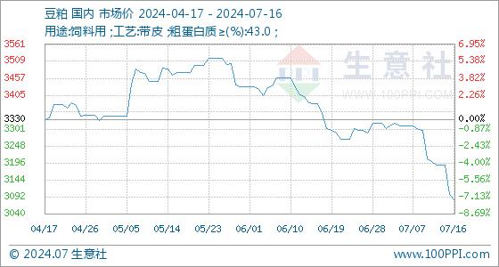 7月16日,生意社豆粕基准价为3100.00元/吨,与本月初(3320.00元/吨)相比,下降了-6.63%。