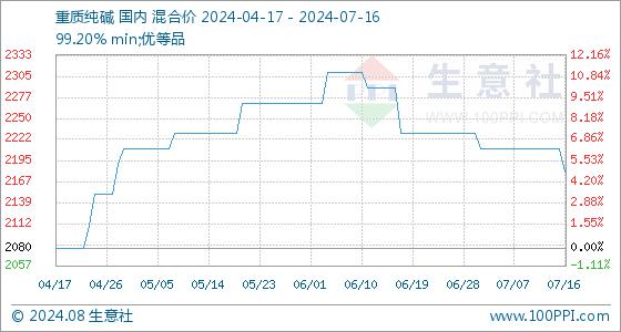 7月16日,生意社重质纯碱基准价为2210.00元/吨,与本月初(2230.00元/吨)相比,下降了-0.90%。
