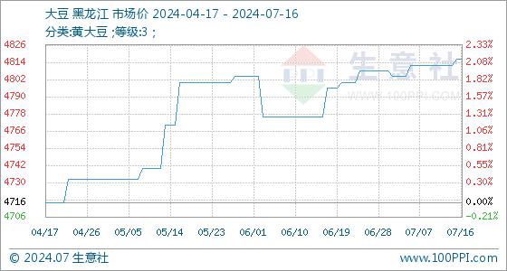 7月16日,生意社大豆基准价为4816.00元/吨,与本月初(4808.00元/吨)相比,上涨了0.17%。
