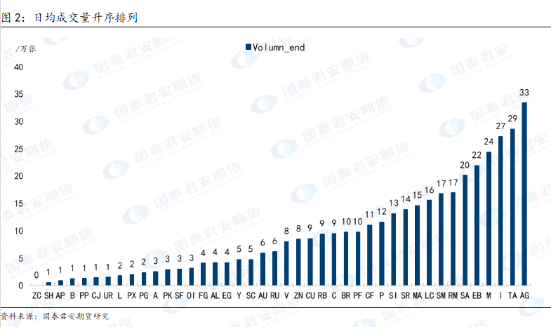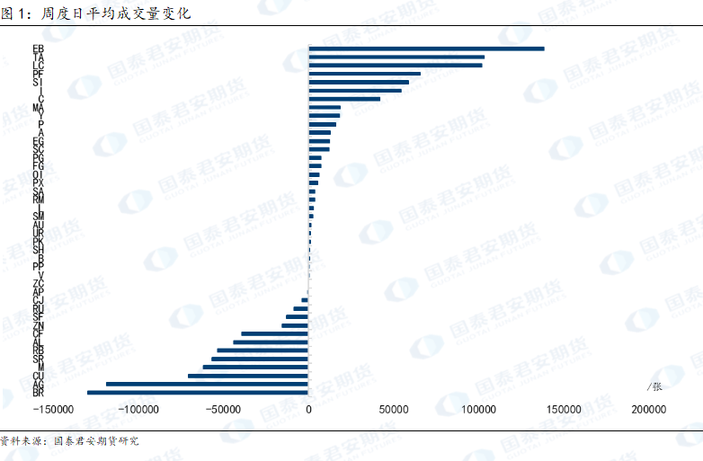 商品期权交易量继续小幅增仓上量,主要是能化与有色板块带来的增量,贵金属期权成交量和持仓量均有所下降。苯乙烯、PTA和碳酸锂期权日均成交量增加超过十万张,合成橡胶和白银期权的日均成交量减少超十万张。白银、PTA和铁矿石的期权交易量排名靠前,新上市的玻璃期权日均成交量约为4万张,红枣期权的日均成交量约为1.5万张。