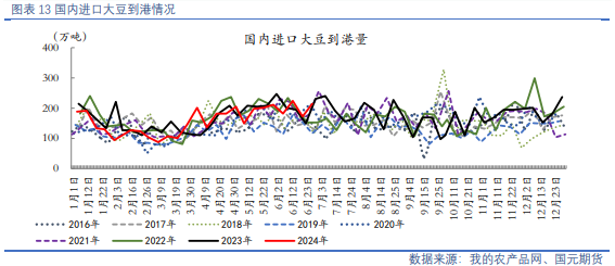 据Mysteel农产品团队对国内各港口到船预估初步统计,预计2024年6月1120万吨,7月1000万吨。24年5月份国内主要地区125家油厂大豆到港预估138.5船,共计约900.25万吨(本月船重按6.5万吨计)。据国家粮油信息中心船期监测显示,三季度我国进口油菜籽到港量较大,预计7-9月月均到港量在45万吨左右。