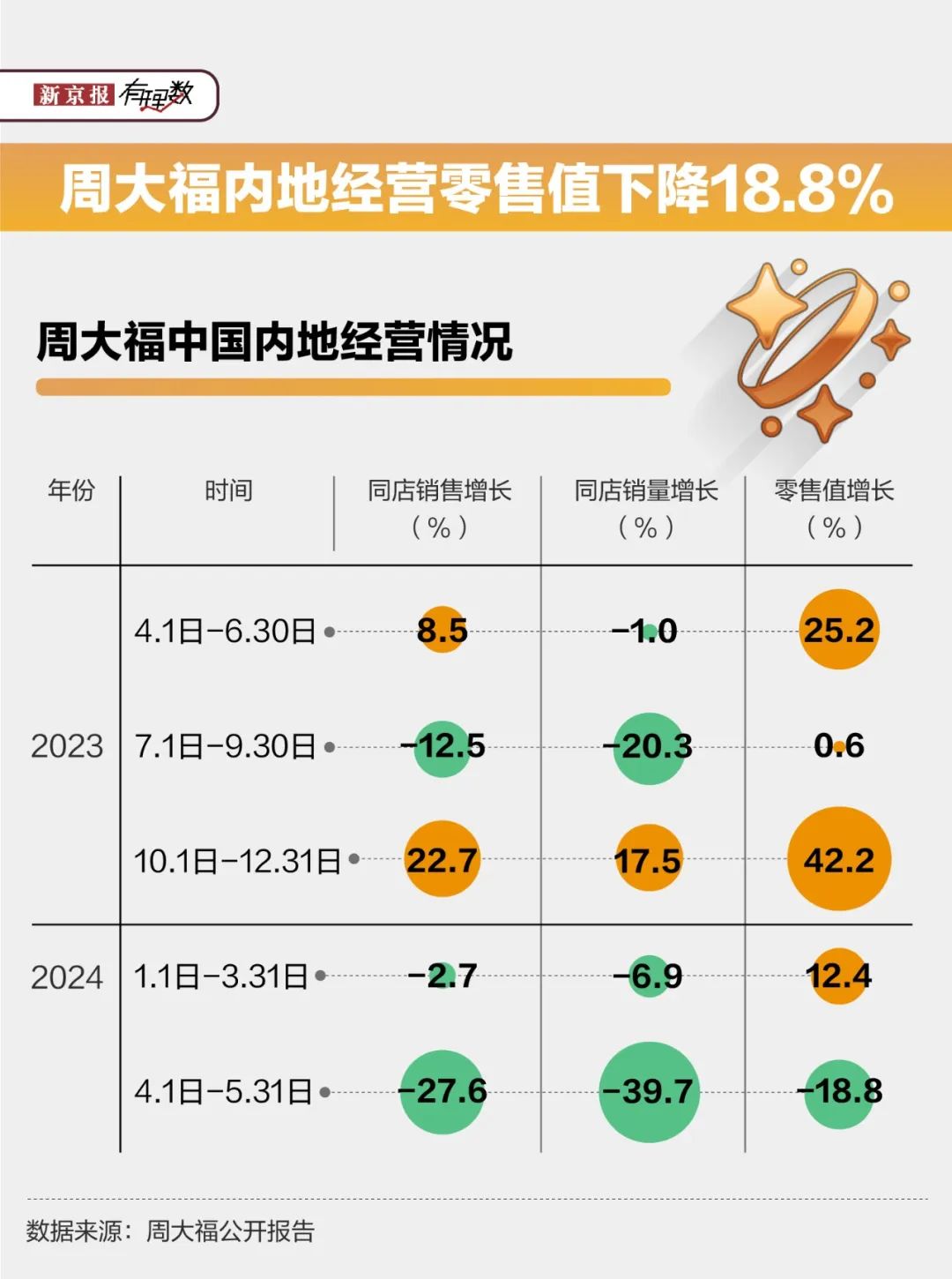 引发市场担忧的,或与年报一同公布的另一组数据有关。周大福公布的2024年4月1日至5月31日未经审核的主要经营数据显示,其零售值较去年同期下降了20.2%,其中,占集团零售值近九成的内地零售值下降了18.8%。