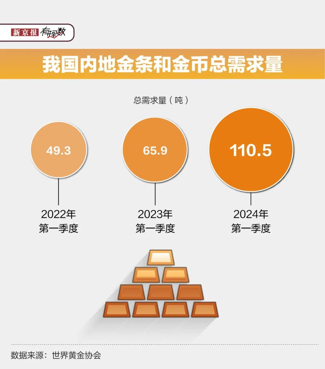 世界黄金协会数据显示,2024年第一季度,中国内地金条与金币需求达110.5吨,同比激增68%,是自2013年以来最强劲的一季度表现。