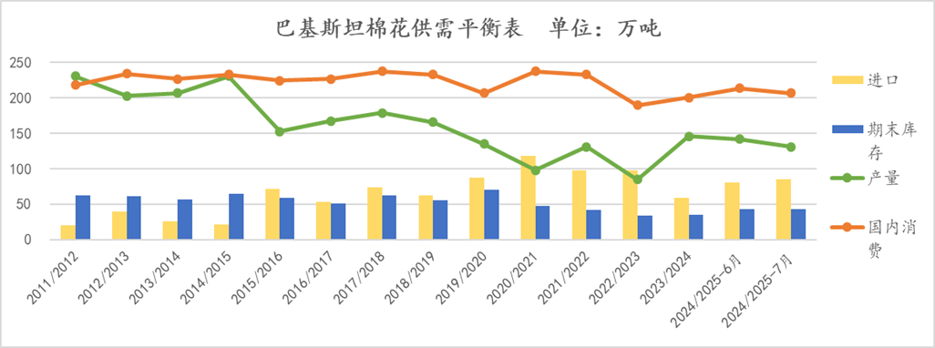 图表6:巴基斯坦棉花供需平衡表单位:万吨