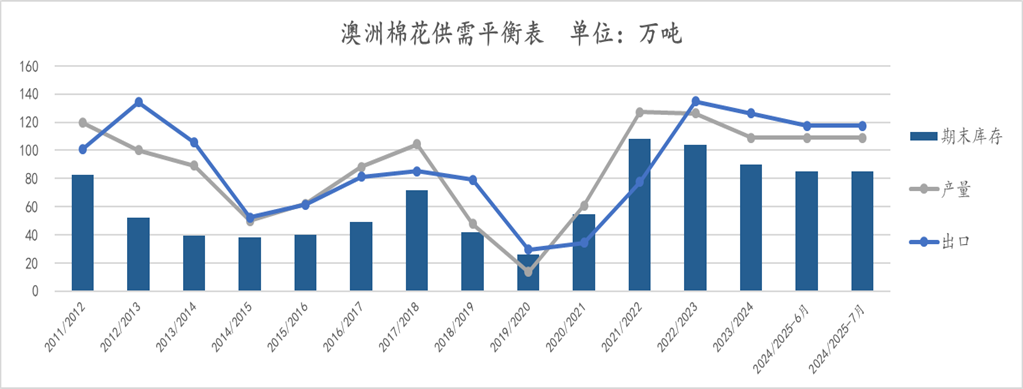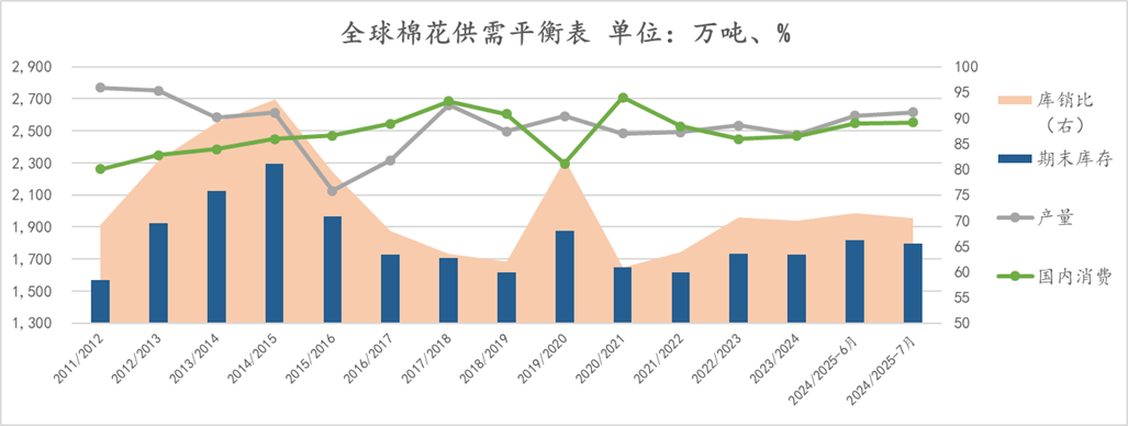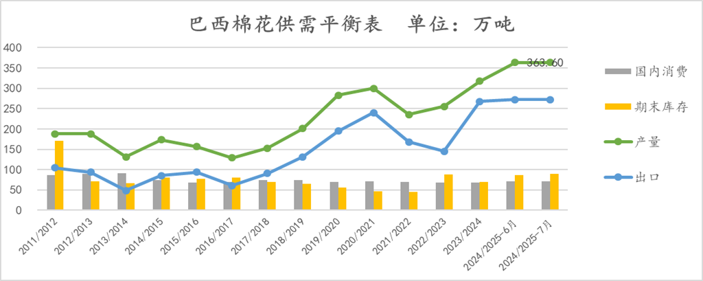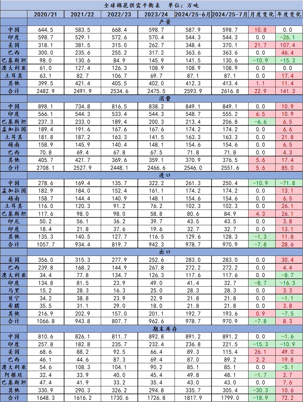 24/25年度全球棉花产量上调22.9万吨,其中美国产量上调21.7万吨至370.1万吨,中国产量上调10.8万吨至598.7万吨,和上年度持平,巴基斯坦产量下调10.9万吨;巴西产量未作调整,巴西国家商品公司在7月的报告中,将巴西产量下调2.1万吨至363.6万吨;继续关注美棉的天气,以及巴西丰产的落地情况。