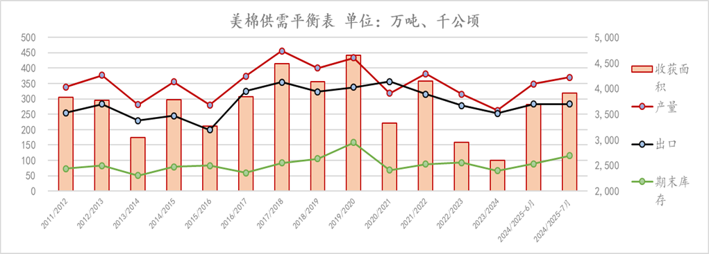 7月的报告中,美棉的种植面积为11.67百万英亩,收获面积为9.67百万英亩,弃耕率为17.14%,上个月的弃耕率为14.43%;7月报告中单产为946千克/公顷,上个月单产为943千克/公顷