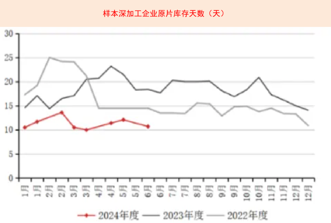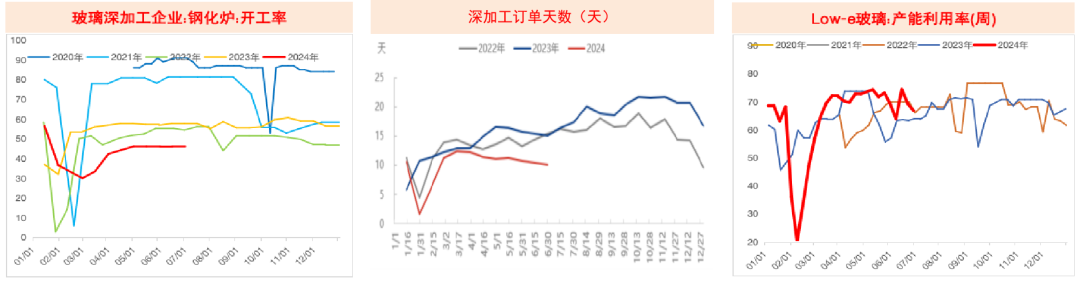 订单少且资金流动性差的情况下,深加工企业持有悲观情绪,不太愿意增加存货。6月中旬的原片库存天数为10.7天,相较于上一年年底下降了3.4天,与2023年同期相比也减少了7.7天