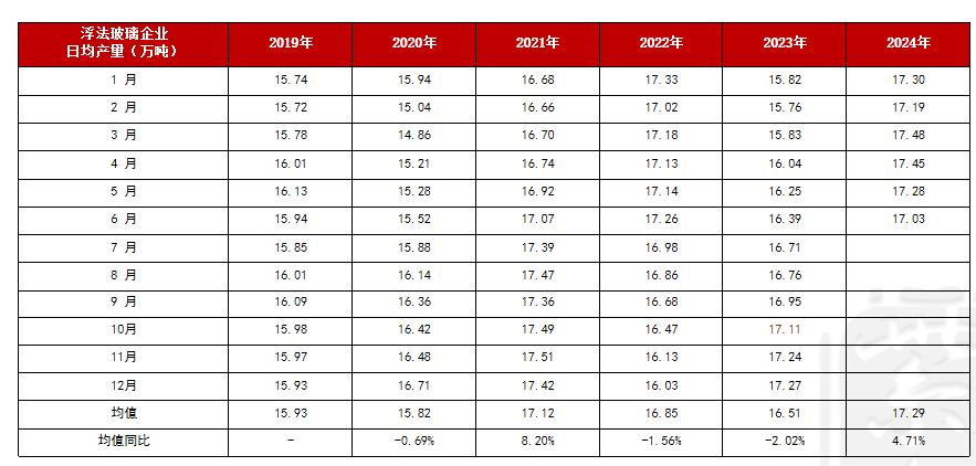 据隆众化工,24年上半年平板玻璃产量同比增加8.5%,其中,二季度增6.4%。上半年平均日熔量17.29万吨,其中,一季度是17.32万吨,二季度是17.25万吨,3月末达到历史最大17.6万吨,6月末日熔量是17万吨,上半年玻璃日熔量总体是逐步下移,但是绝对水平仍然是历史高位。