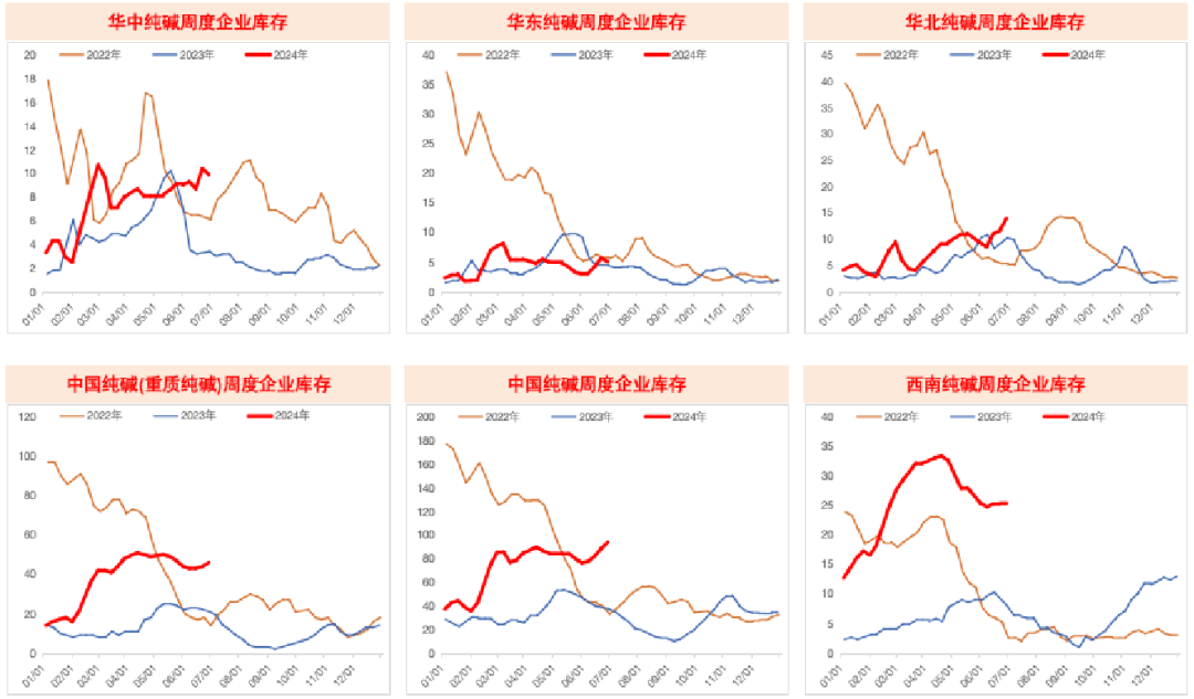 华北、华东和华中地区相较于其他地区,其纯碱库存量处于较低水平