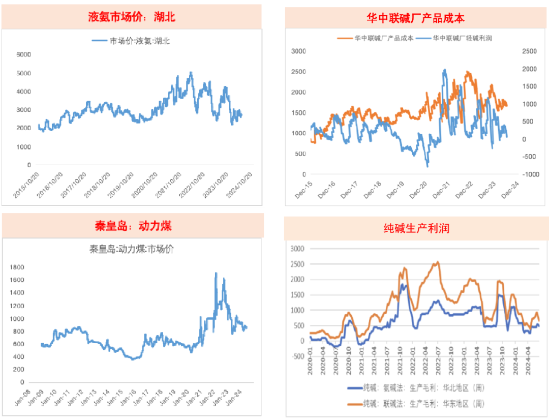 近期,纯碱成本端的关键原料如煤炭和液氨的价格上升趋势有所放缓,而纯碱成品价格则持续下降。